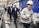 Средне-Невский судостроительный завод (СНСЗ). Презентация сборки и строительства катамаранов проектов "Котлин" и "Соммерс". Руководитель проектного офиса по созданию туристско-рекреационного кластера "Остров фортов" Ксения Шойгу (справа) во время посещения СНСЗ.