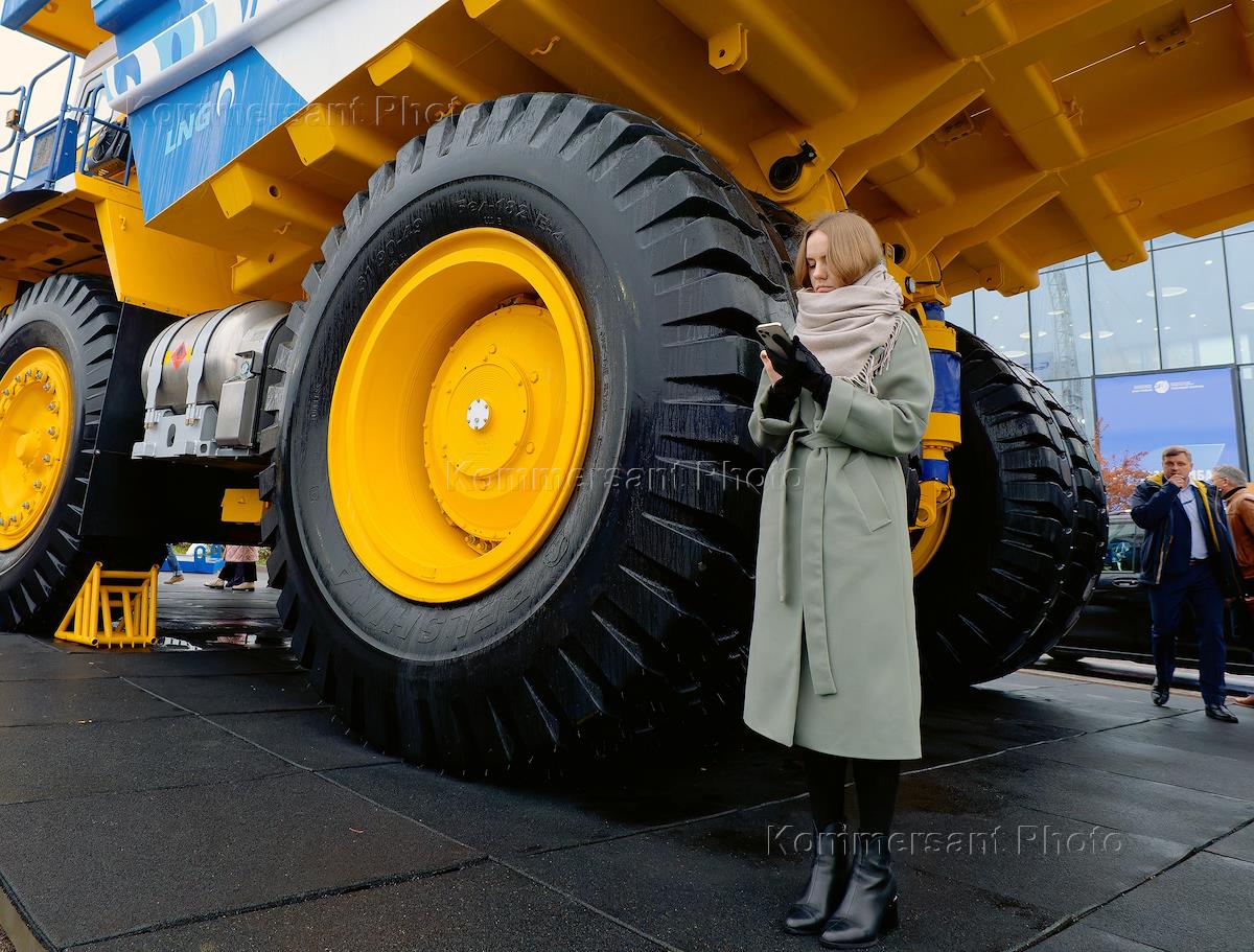 XII Петербургский международный газовый форум (ПМГФ-2023) в конгрессно-выставочном центре "Экспофорум". Модель карьерного самосвала "Эко БелАз" на выставке в рамках форума.
