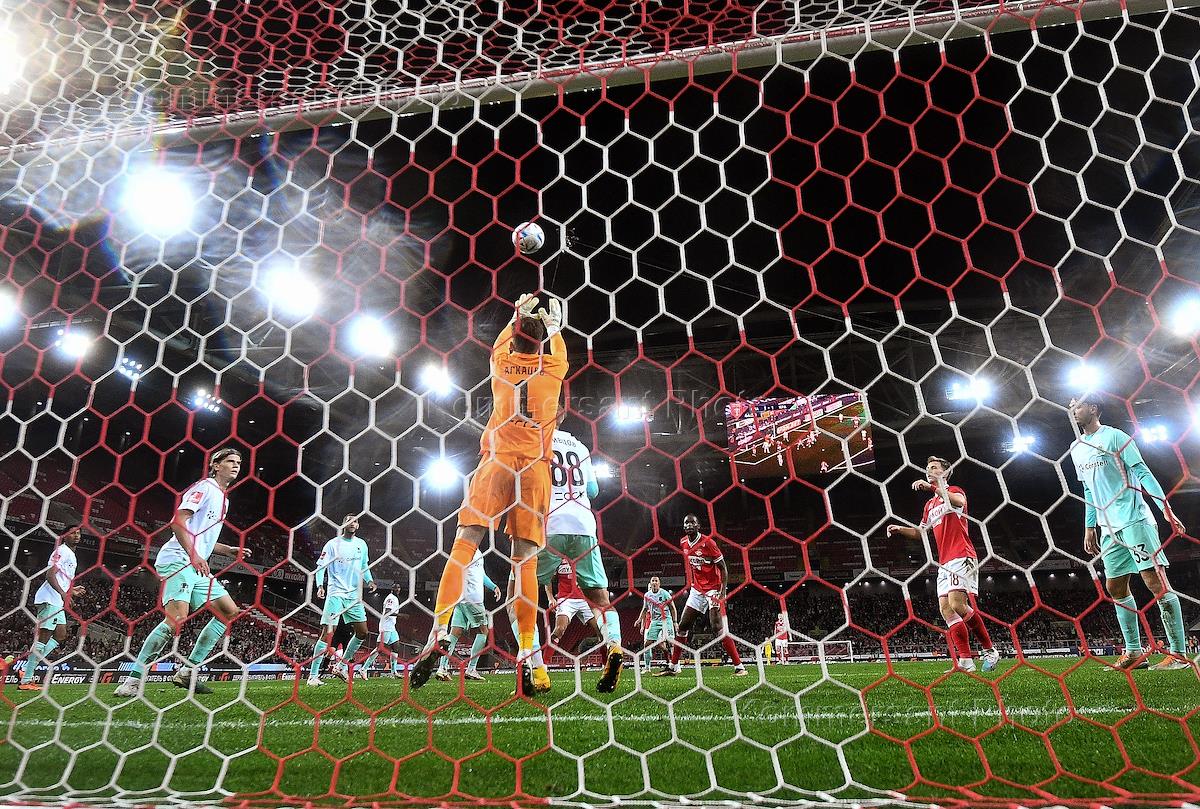 Фонбет - Кубок России по футболу 2023/24. Матч между командами "Спартак" (Москва) — "Краснодар" (Краснодар) на стадионе "Открытие Банк Арена". Вратарь команды "Краснодар" Станислав Агкацев во время матча.