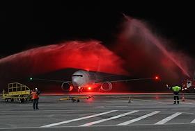 Старт полетной программы авиакомпании Flydubai из Волгограда в Дубай. Жанровая фотография. Взлет самолета первого прямого регулярного рейса из Волгограда в Дубай в здании Международного аэропорта Волгоград.