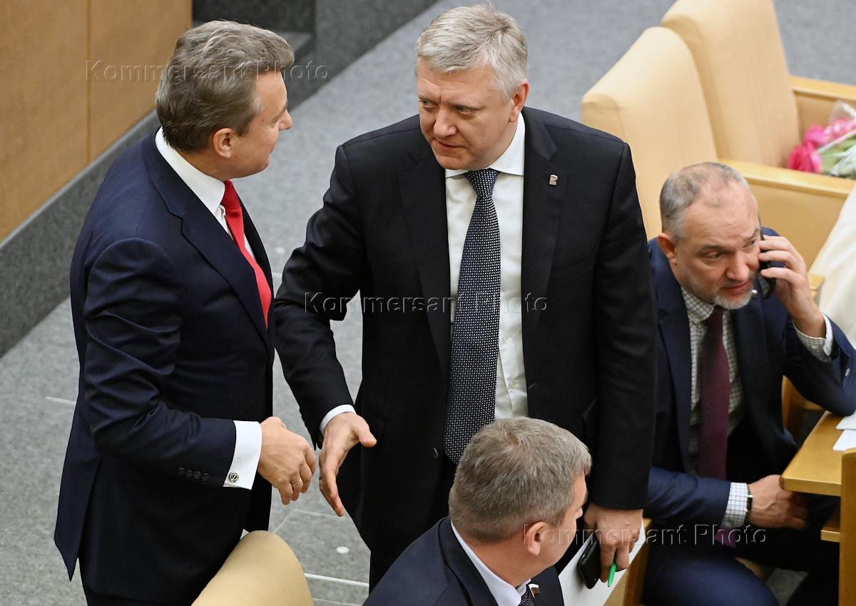 Пленарное заседание Государственной думы (ГД) России. Заместитель руководителя фракции "Единая России" в ГД России Евгений Ревенко (в центре) и член комитета ГД России по транспорту и развитию транспортной инфраструктуры Сергей Еремин (справа) во время заседания.