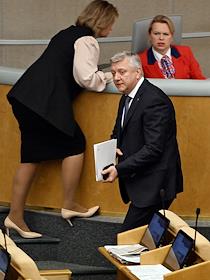 Пленарное заседание Государственной думы (ГД) России. Заместители председателя комитета ГД России по аграрным вопросам Николай Гончаров (слева) и Юлия Оглоблина (справа) во время заседания.