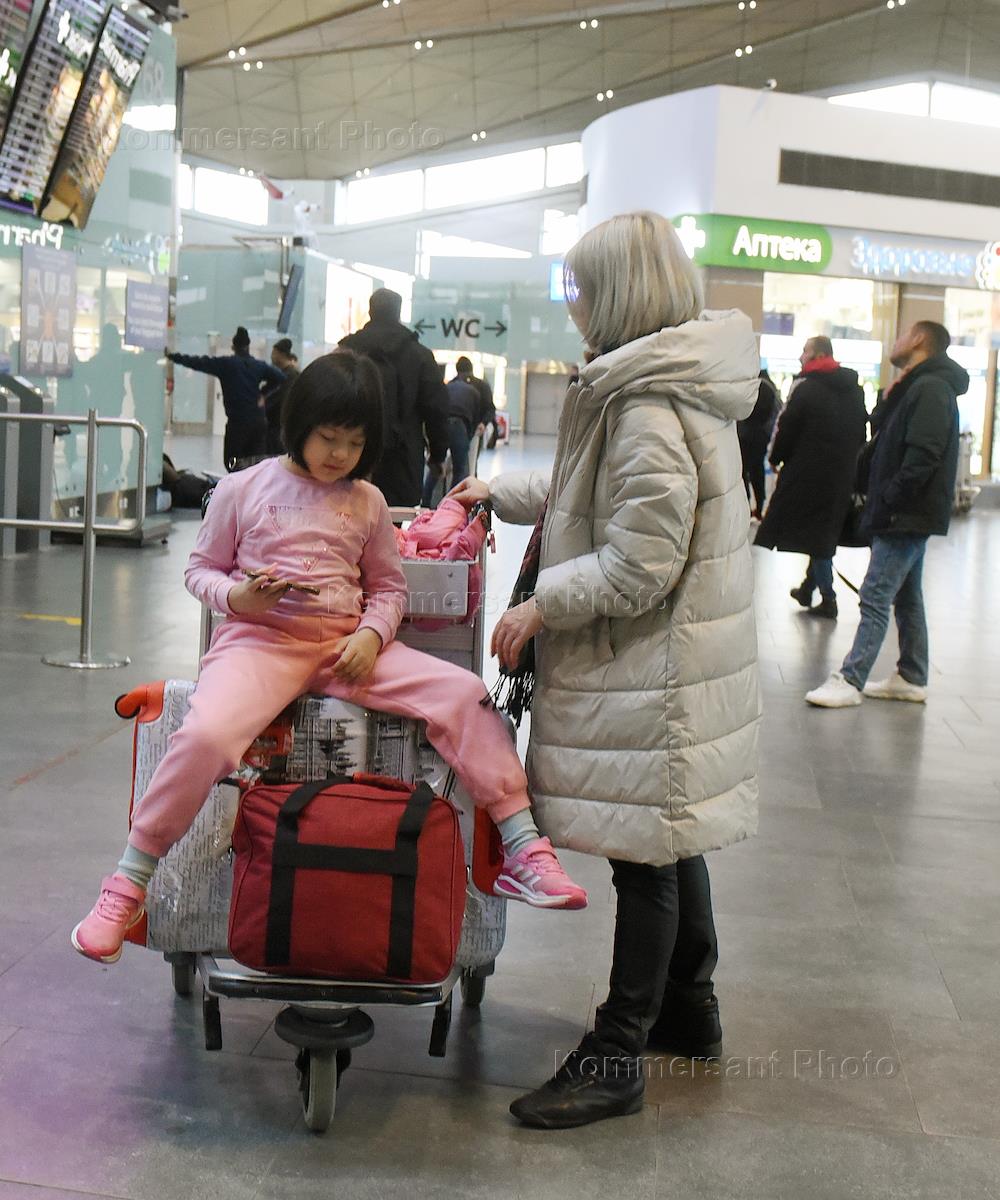 Международный аэропорт Пулково имени писателя Федора Достоевского. Церемония открытия информационной стойки в стиле русских сказок "Инфоизба" в зале аэропорта. Жанровая фотография. Женщина с ребенком и тележкой с багажом в зале ожидания.