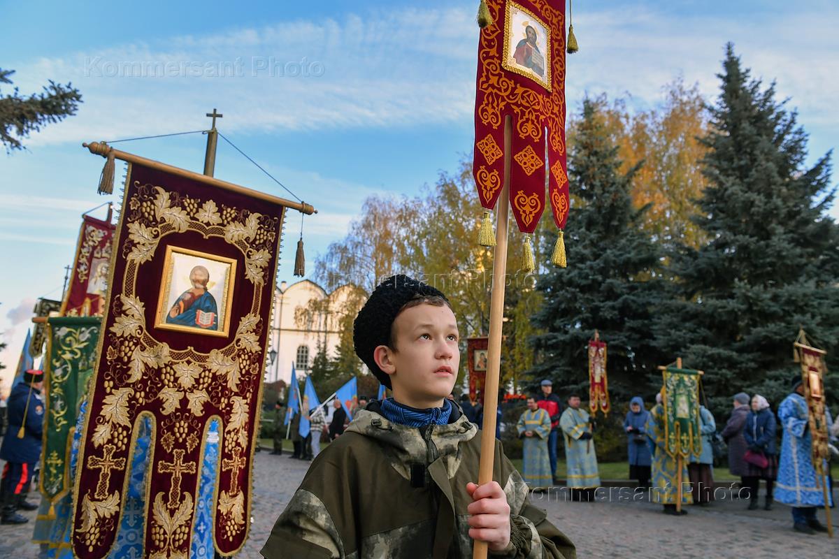 Общегородской крестный ход в праздник Казанской иконы Божией Матери и День народного единства от стен древнего Благовещенского собора Казанского кремля до Казанского Богородицкого монастыря у места обретения в 1579 году иконы. Участники во время мероприятия.