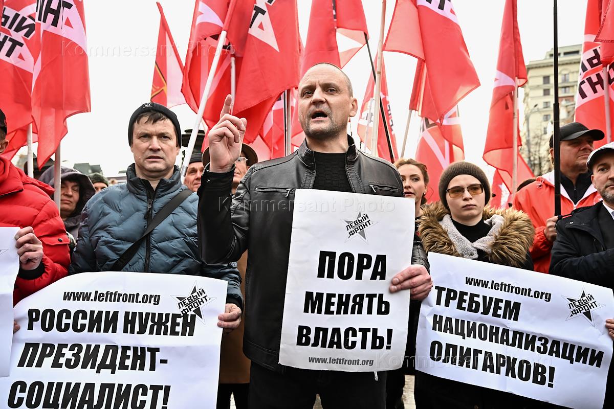 Митинг и церемония возложение венка к Мавзолею Владимира Ленина, посвященные 106-й годовщине Великой Октябрьской социалистической революции. Лидер движения "Левый фронт" Сергей Удальцов (в центре) на митинге.