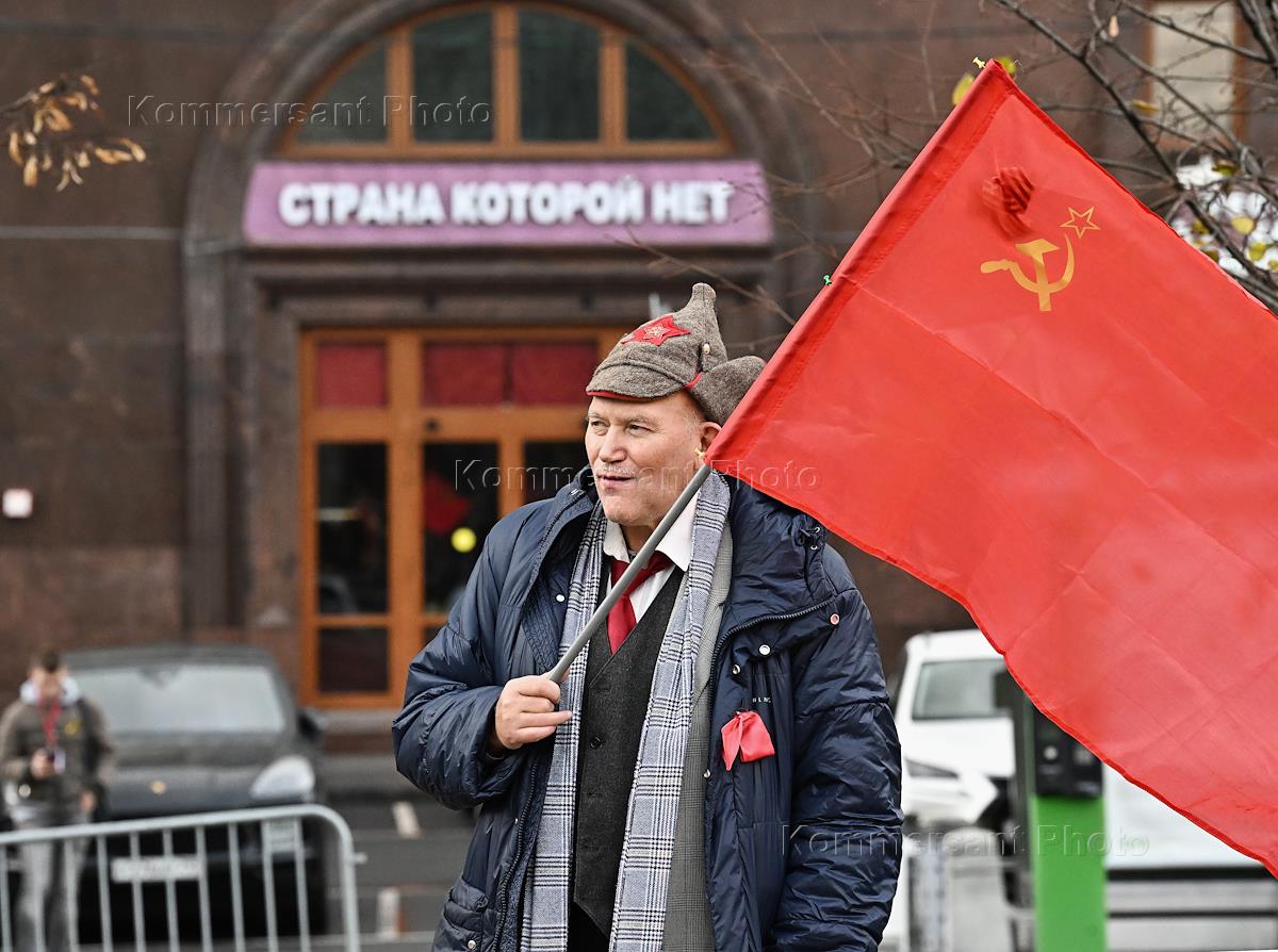 Митинг и церемония возложение венка к Мавзолею Владимира Ленина, посвященные 106-й годовщине Великой Октябрьской социалистической революции. Участники митинга с красным флагом с логотипом КПРФ.