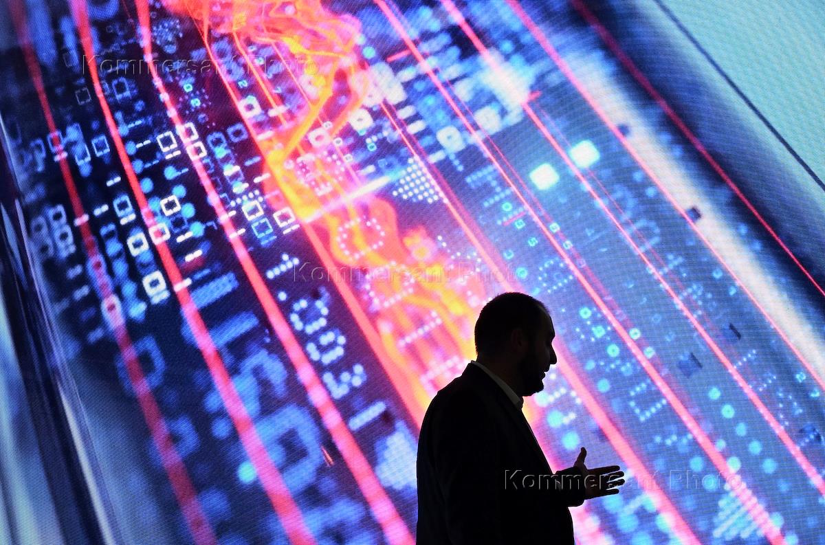 Форум инновационных финансовых технологий Finopolis в МВЦ "Крокус Экспо". Выставка в рамках форума. Жанровая фотография. Мужчина на фоне информационного цифрового стенда.