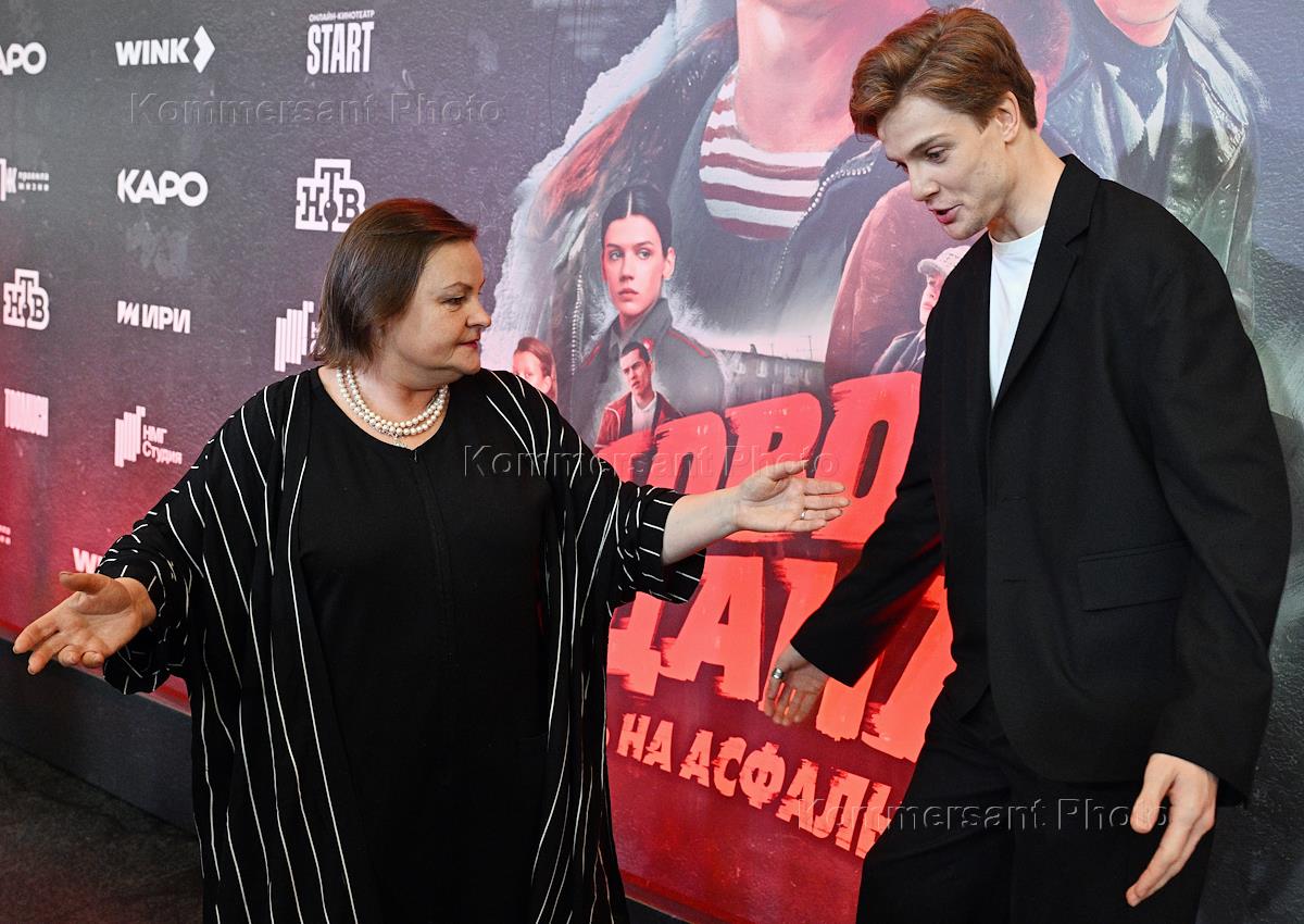 Премьерный показ фильма "Слово пацана. Кровь на асфальте" режиссера Жоры Крыжовникова в кинотеатре "Каро 11 октябрь". Продюсер Галина Стрижевская (слева) и актер Слава Копейкин (справа) перед началом показа.