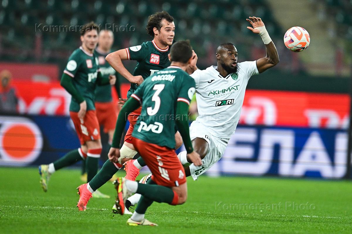 Российская Премьер-Лига (РПЛ). МИР - Чемпионат России по футболу 2023/2024. 15-й тур. Матч между командами "Локомотив"(Москва) - "Ахмат" (Грозный) на стадионе "РЖД Арена". Игрок команды "Ахмат" Мохамед Конате (справа) во время матча.