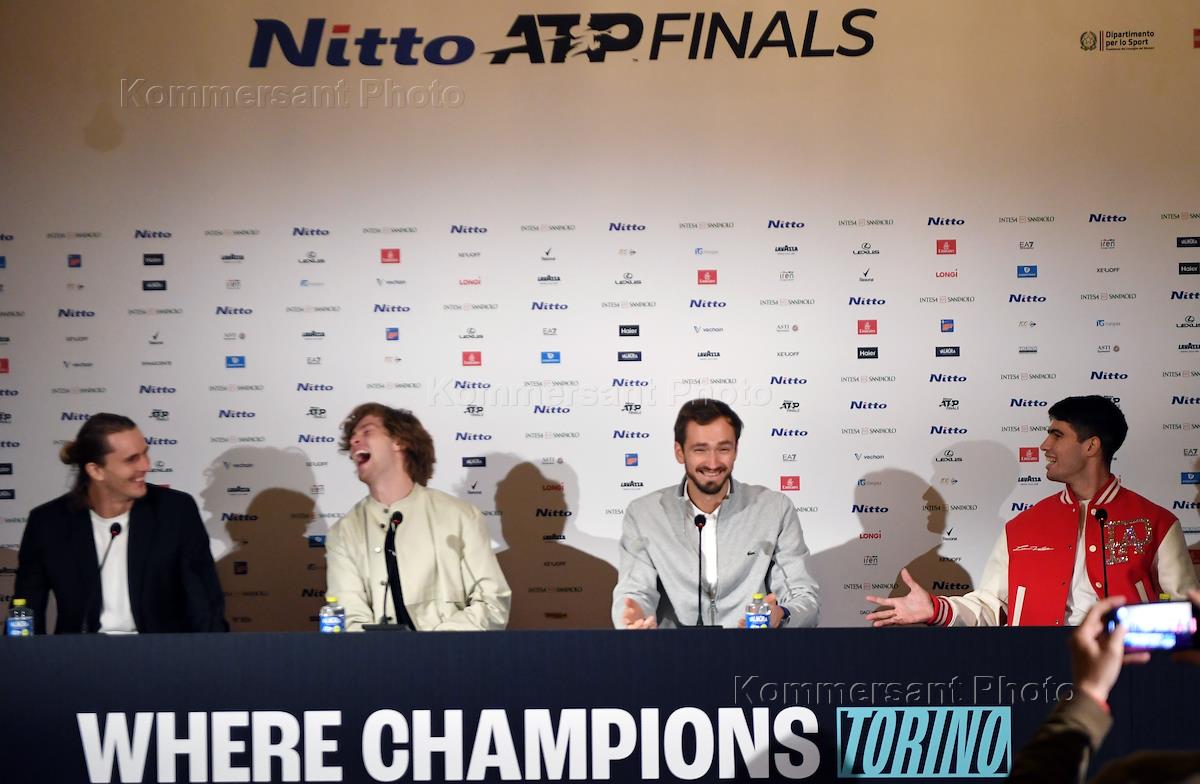 Ежегодный итоговый турнир среди мужчин ATP Finals 2023 в Турине. Пресс-конференции игроков перед началом турнира. Слева направо: немецкий теннисист Александр Зверев, российские теннисисты Андрей Рублев, Даниил Медведев и испанский теннисист Карлос Алькарас во время пресс-конференции.