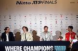 Ежегодный итоговый турнир среди мужчин ATP Finals 2023 в Турине. Пресс-конференции игроков перед началом турнира. Слева направо: датский теннисист Хольгер Руне, греческий теннисист Стефанос Циципас, итальянский теннисист Янник Синнер и сербский теннисист Новак Джокович во время пресс-конференции.