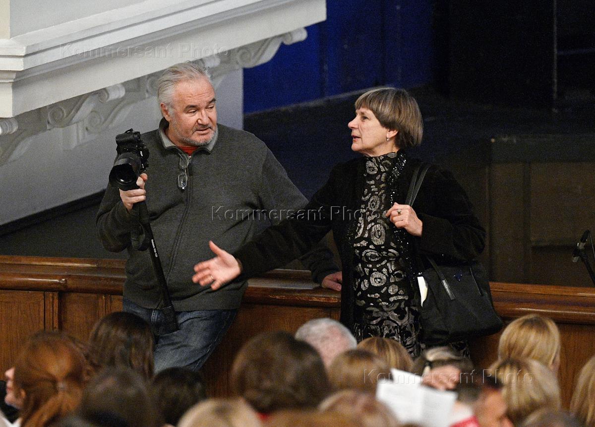 "Гала-концерт. Владислав Лантратов" на сцене Музыкального театра имени К.С.Станиславского и Вл.И.Немировича-Данченко. Корреспондент ИД "Коммерсантъ" Татьяна Кузнецова (справа) и фотограф Игорь Захаркин (слева) перед началом гала-концерта.