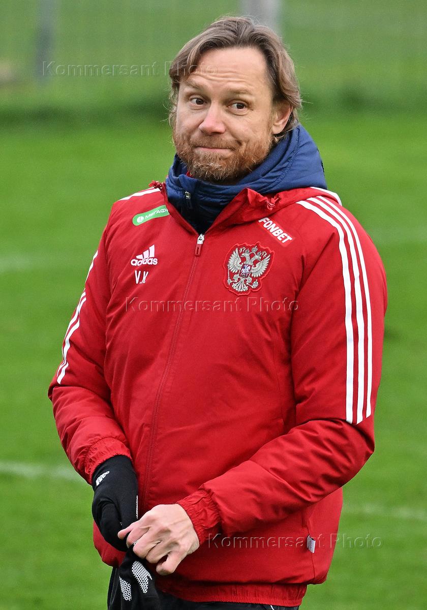 Тренировка национальной сборной команды России по футболу в Учебно-тренировочном Центре "Новогорск". Член тренерского штаба сборной России по футболу Николай Писарев во время тренировки.