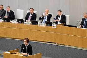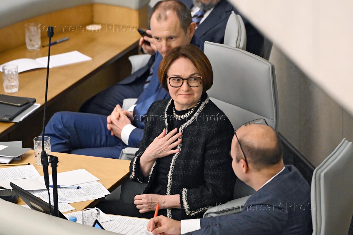 Пленарное заседание Государственной думы (ГД) России. Председатель Центрального Банка России Эльвира Набиуллина (в центре) во время заседания.