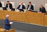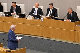Пленарное заседание Государственной думы (ГД) России. Заместитель председателя комитета ГД России по экономической политике Михаил Делягин (второй справа) и член комитета ГД России по международным делам Роза Чемерис (слева) во время заседания.