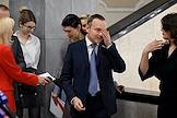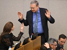 Пленарное заседание Государственной думы (ГД) России. Первый заместитель председателя комитета ГД России по финансовому рынку Константин Бахарев (в центре) перед началом заседания.