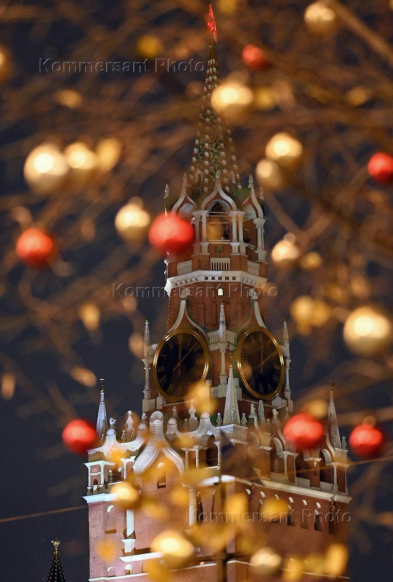 Виды Москвы. Красная площадь. Жанровая фотография. Новогодние игрушки на дереве и Спасская башня Московского кремля.
