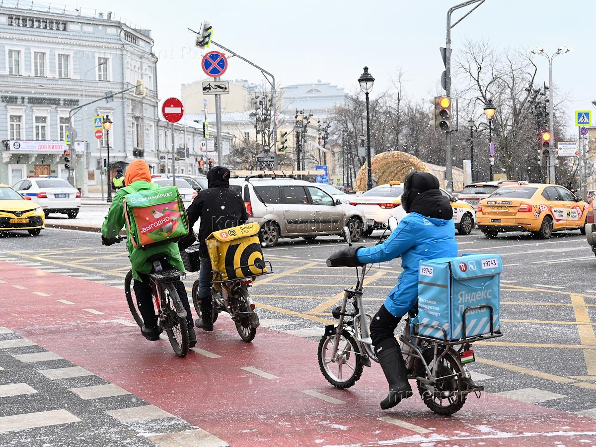 Виды Москвы. Жанровая фотография. Курьеры службы доставки еды на велосипедах на улице.