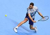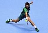 Ежегодный итоговый турнир среди мужчин ATP Finals 2023 в Турине. Сербский теннисист Новак Джокович во время матча с польским теннисистом Хубертом Хуркачем.