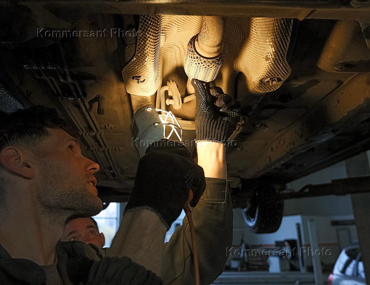 Официальный автосервис Lada в Волгограде. Жанровая фотография. Сервисный инженер во время замены технических жидкостей автомобиля Lada.