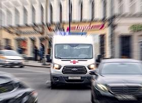 Виды Москвы. Жанровая фотография. Автомобиль скорой медицинской помощи на улице.