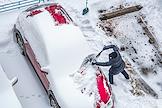Жанровая фотография. Мужчина во время уборки снега с автомобиля.
