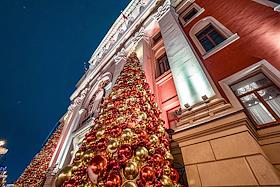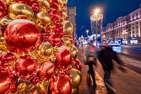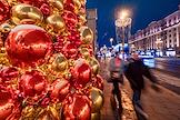 Виды Москвы. Тверская улица. Жанровая фотография. Новогоднее оформление улиц города. Праздничные конструкции из новогодних шаров у здания мэрии Москвы.