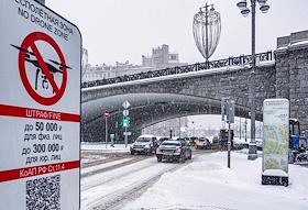 Жанровая фотография. Снегопад в городе. Автомобили едут по Софийской набережной во время снегопада. Стенд с информацией о запрете полета дронов (беспилотников) и расценка штрафов за нарушение.