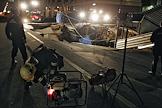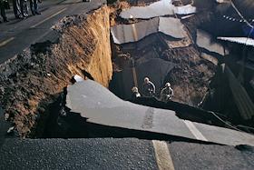 Сотрудники аварийных служб города осматривают место провала грунта на Ленинградском проспекте у дома № 30. На месте провала образовалась яма 20 на 40 метров глубиной около 15 метров. Вместе с песком, кусками асфальта, мачтой городского освещения в яме очутился автомобиль "КамАЗ".