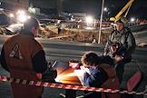 Сотрудник МЧС России осматривает место провала грунта на Ленинградском проспекте у дома № 30. На месте провала образовалась яма 20 на 40 метров глубиной около 15 метров. Вместе с песком, кусками асфальта, мачтой городского освещения в яме очутился автомобиль "КамАЗ".