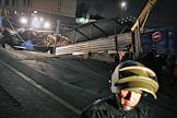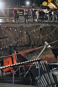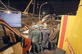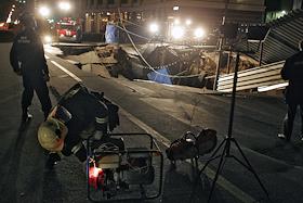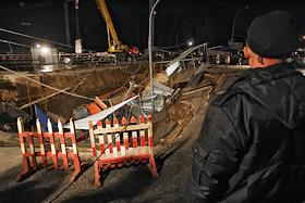 Сотрудники аварийных служб города осматривают место провала грунта на Ленинградском проспекте у дома № 30. На месте провала образовалась яма 20 на 40 метров глубиной около 15 метров. Вместе с песком, кусками асфальта, мачтой городского освещения в яме очутился автомобиль "КамАЗ".