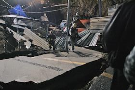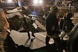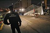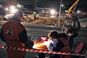 Сотрудник МЧС России осматривает место провала грунта на Ленинградском проспекте у дома № 30. На месте провала образовалась яма 20 на 40 метров глубиной около 15 метров. Вместе с песком, кусками асфальта, мачтой городского освещения в яме очутился автомобиль "КамАЗ".