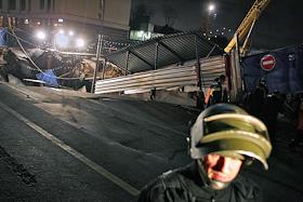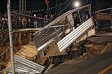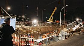 Место провала грунта на Ленинградском проспекте у дома № 30. На месте провала образовалась яма 20 на 40 метров глубиной около 15 метров. Вместе с песком, кусками асфальта, мачтой городского освещения в яме очутился автомобиль "КамАЗ".