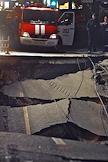 Место провала грунта на Ленинградском проспекте у дома № 30. На месте провала образовалась яма 20 на 40 метров глубиной около 15 метров. Вместе с песком, кусками асфальта, мачтой городского освещения в яме очутился автомобиль "КамАЗ". Машина МЧС на месте происшествия.