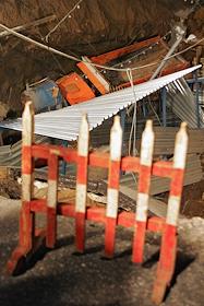 Дорожный знак "Проход запрещен" на месте провала грунта на Ленинградском проспекте у дома № 30. На месте провала образовалась яма 20 на 40 метров глубиной около 15 метров. Вместе с песком, кусками асфальта, мачтой городского освещения в яме очутился автомобиль "КамАЗ".