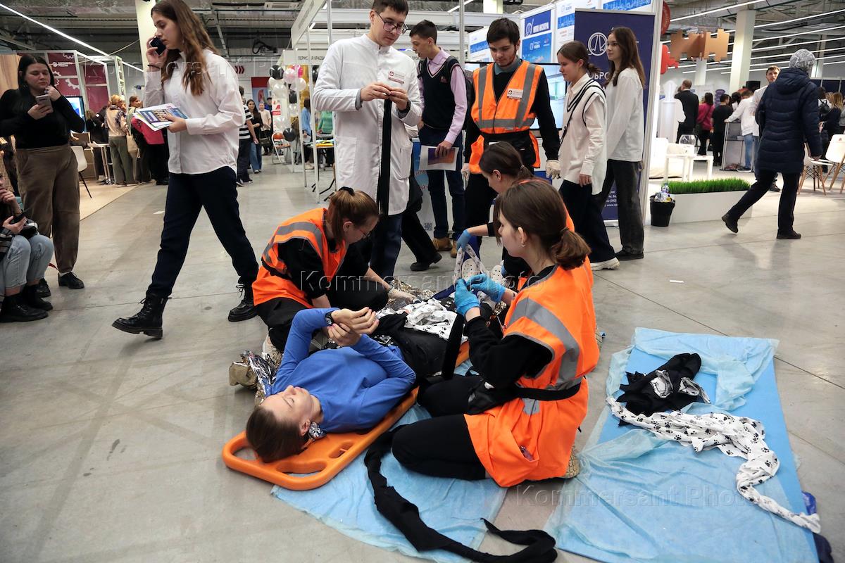 Пермская выставка-форум "Образование и карьера" в конгрессно-выставочном центре (КВЦ) "Пермь Экспо". Жанровая фотография. Стенды Пермского Государственного Медицинского Университета. Студенты учится оказанию первой медицинской помощи пострадавшему