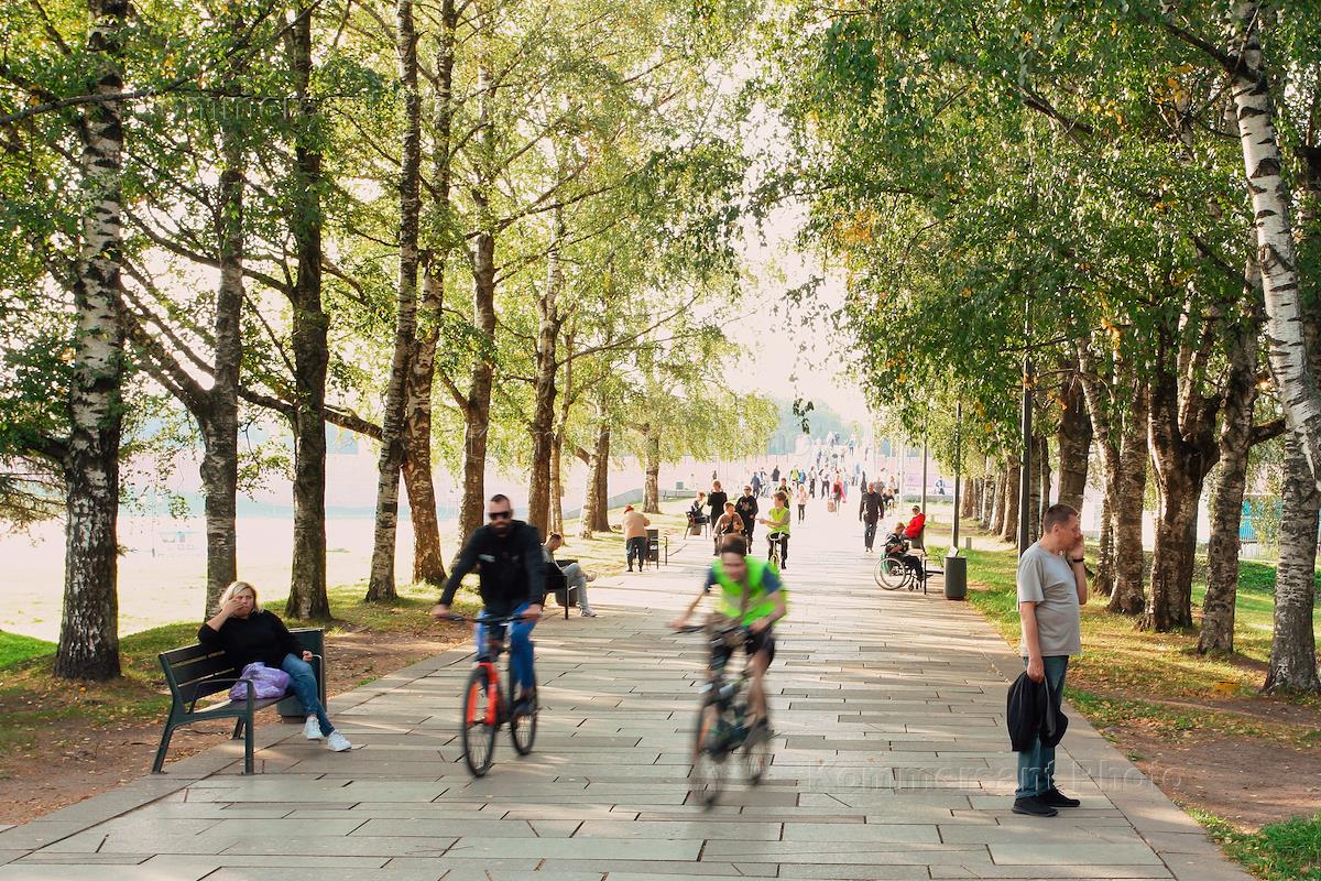 Жанровая фотография. Дети в сигнальных жилетах едут на велосипедах и самокатах по улице Ильина после прошедших спортивных мероприятий в городе.