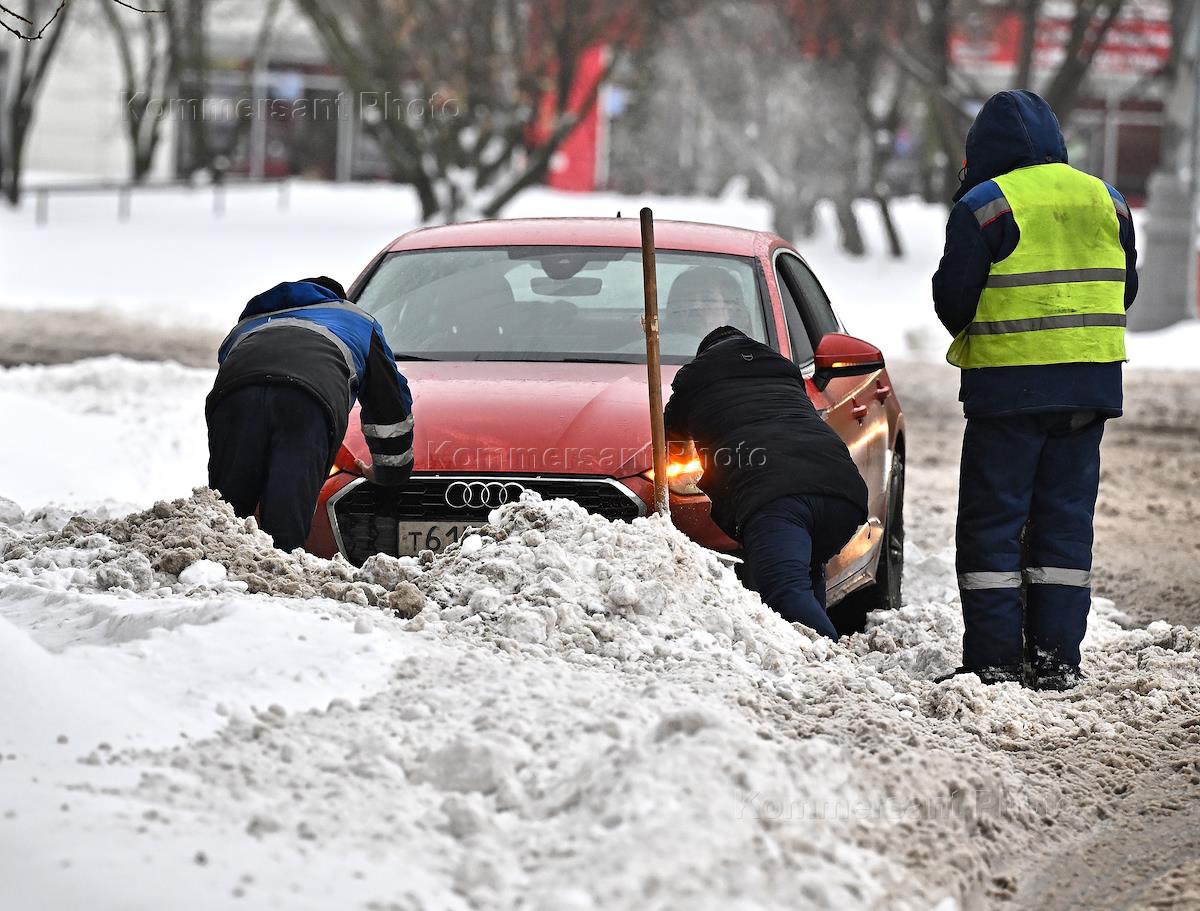 Жанровая фотография. Последствия снегопада в Москве. Сотрудники коммунальных служб города во время уборки снега на улице и выталкивания из сугроба автомобиль.