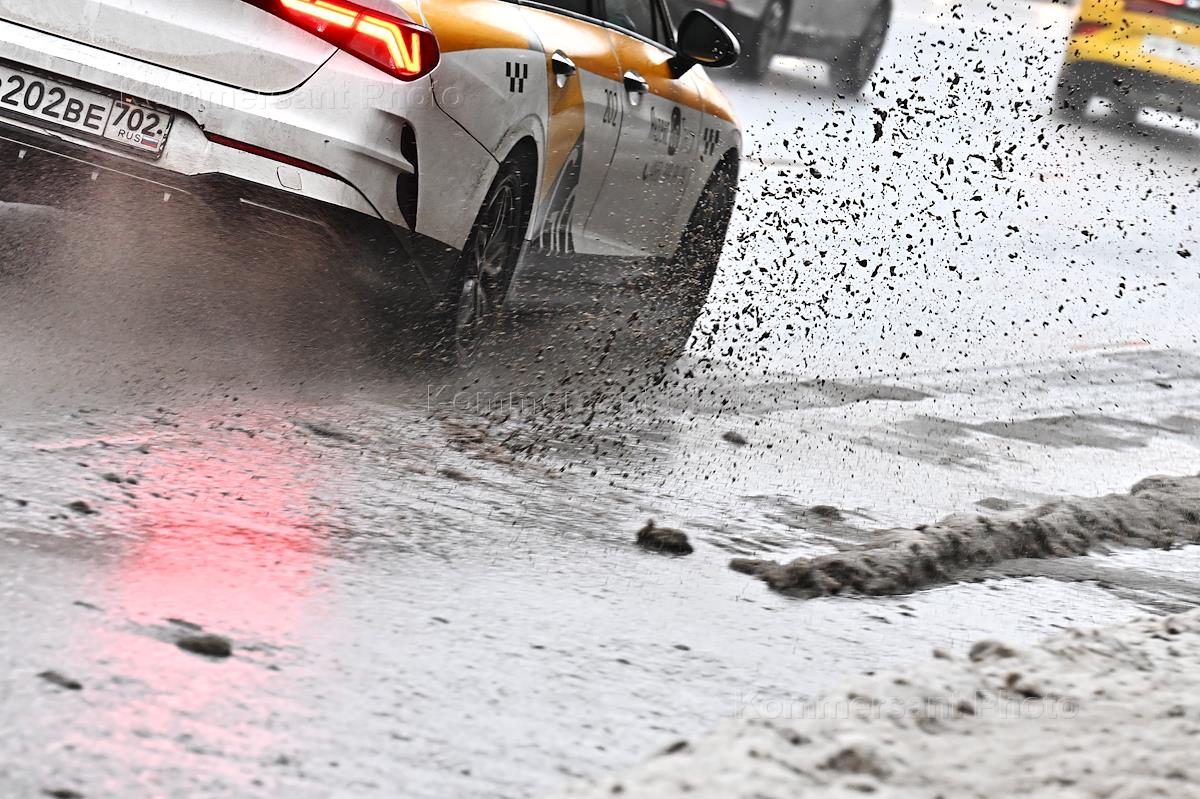Жанровая фотография. Последствия снегопада в Москве. Автомобиль такси едет по снежной слякоти по трассе.