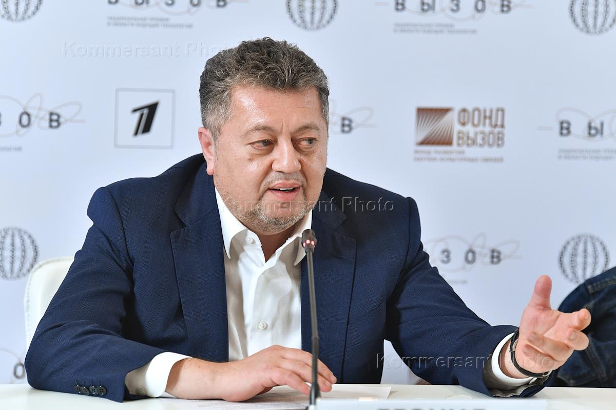 Пресс-конференция, посвященная первой церемонии вручения Национальной премии в области будущих технологий "ВЫЗОВ" в ЦВЗ "Манеж". Генеральный директор Российского квантового центра Руслан Юнусов (справа) во время пресс-конференции.
