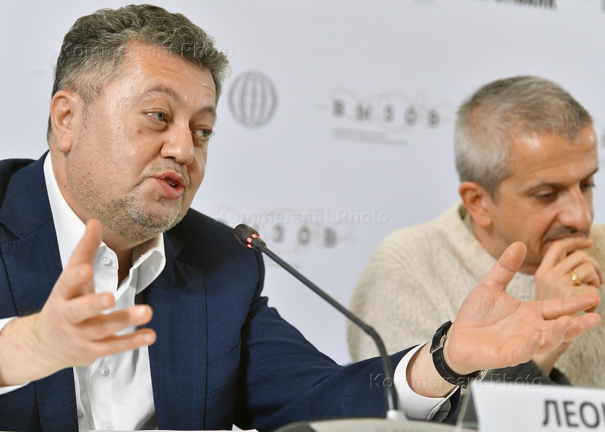 Пресс-конференция, посвященная первой церемонии вручения Национальной премии в области будущих технологий "ВЫЗОВ" в ЦВЗ "Манеж". Президент Фонда развития научно-культурных связей "Вызов" Леонид Шляховер (слева) и художественный руководитель "Театра на Бронной", режиссер Константин Богомолов (справа) во время пресс-конференции.
