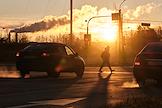 Виды Пскова. Жанровая фотография. Житель города идет по наземному пешеходному переходу на фоне восходящего солнца.