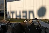 Виды Пскова. Жанровая фотография. Тень указателя магазина сети гипермаркетов "Лента".