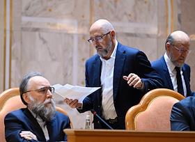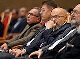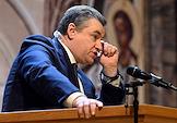 Юбилейный XXV Всемирный русский народный собор, посвященный теме "Настоящее и будущее Русского мира", в Зале Церковных Соборов Храма Христа Спасителя. Председатель Либерально-демократической партии России (ЛДПР), руководитель фракции ЛДПР в Государственной думе России Леонид Слуцкий во время заседания перед началом работы тематических секций.