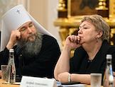 Юбилейный XXV Всемирный русский народный собор (ВРНС), посвященный теме "Настоящее и будущее Русского мира", в Зале Церковных Соборов Храма Христа Спасителя. Митрополит Екатеринбургский и Верхотурский Евгений (слева) и президент Российской академии образования Ольга Васильева (справа) во время заседания перед началом работы тематических секций.