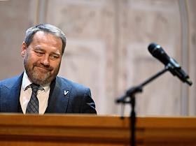 Юбилейный XXV Всемирный русский народный собор (ВРНС), посвященный теме "Настоящее и будущее Русского мира", в Зале Церковных Соборов Храма Христа Спасителя. Глава Республики Коми Владимир Уйба во время заседания перед началом работы тематических секций.
