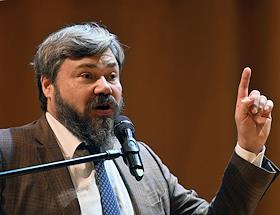 Юбилейный XXV Всемирный русский народный собор (ВРНС), посвященный теме "Настоящее и будущее Русского мира", в Зале Церковных Соборов Храма Христа Спасителя. Философ, лидер движения "Евразия" Александр Дугин (слева) и председатель Законодательного собрания Санкт-Петербурга Александр Бельский (справа) во время заседания перед началом работы тематических секций.