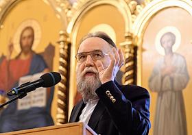 Юбилейный XXV Всемирный русский народный собор (ВРНС), посвященный теме "Настоящее и будущее Русского мира", в Зале Церковных Соборов Храма Христа Спасителя. Слева направо: философ, лидер движения "Евразия" Александр Дугин, начальник управления президента России по обеспечению деятельности Государственного совета России Александр Харичев и заместитель главы ВРНС, ректор Российского православного университета Александр Щипков во время заседания перед началом работы тематических секций.