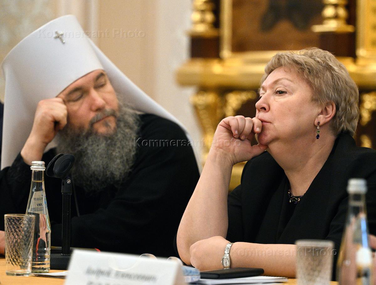 Юбилейный XXV Всемирный русский народный собор (ВРНС), посвященный теме "Настоящее и будущее Русского мира", в Зале Церковных Соборов Храма Христа Спасителя. Митрополит Екатеринбургский и Верхотурский Евгений (слева) и президент Российской академии образования Ольга Васильева (справа) во время заседания перед началом работы тематических секций.