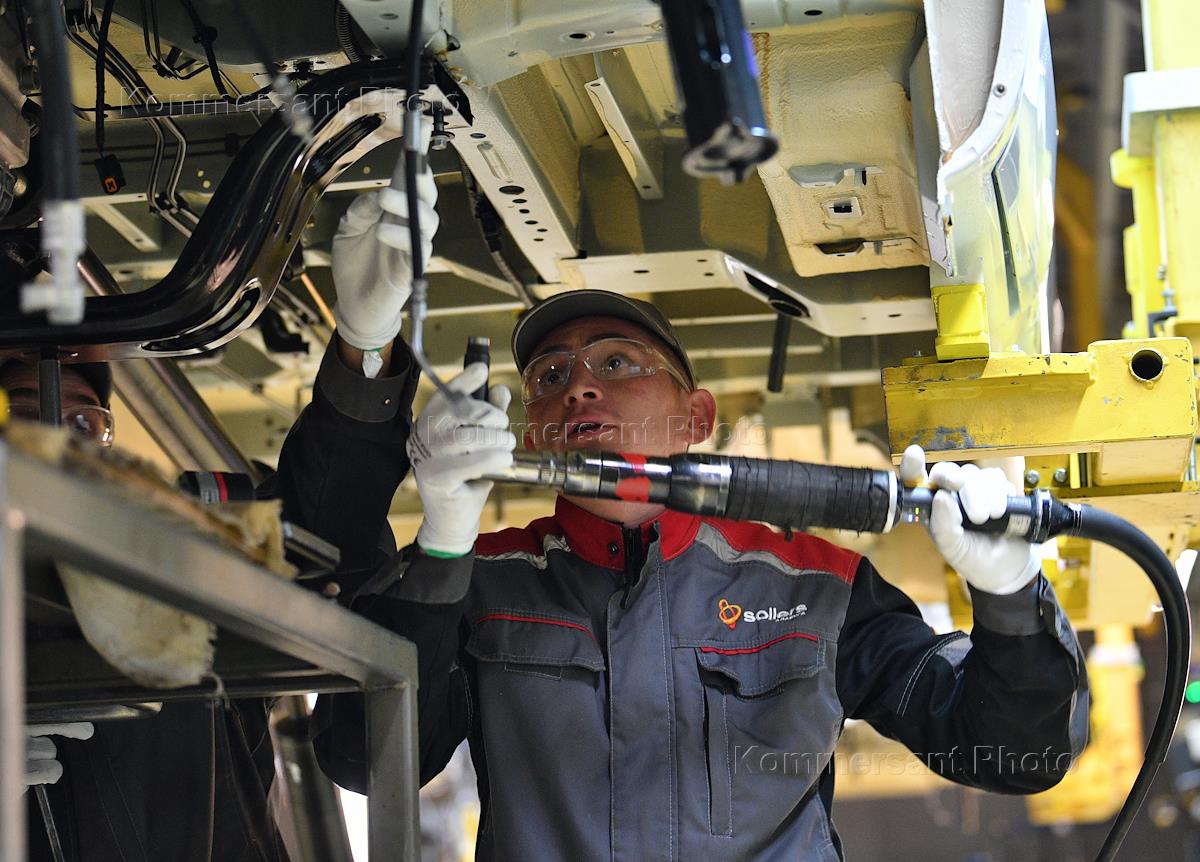 Работа производства ООО "СОЛЛЕРС Алабуга" в Елабужском муниципальном районе. Производство модельной линейки легких коммерческих автомобилей под брендом СОЛЛЕРС. Сотрудники производства во время сборки автомобиля Sollers Atlant на конвейере в цехе.